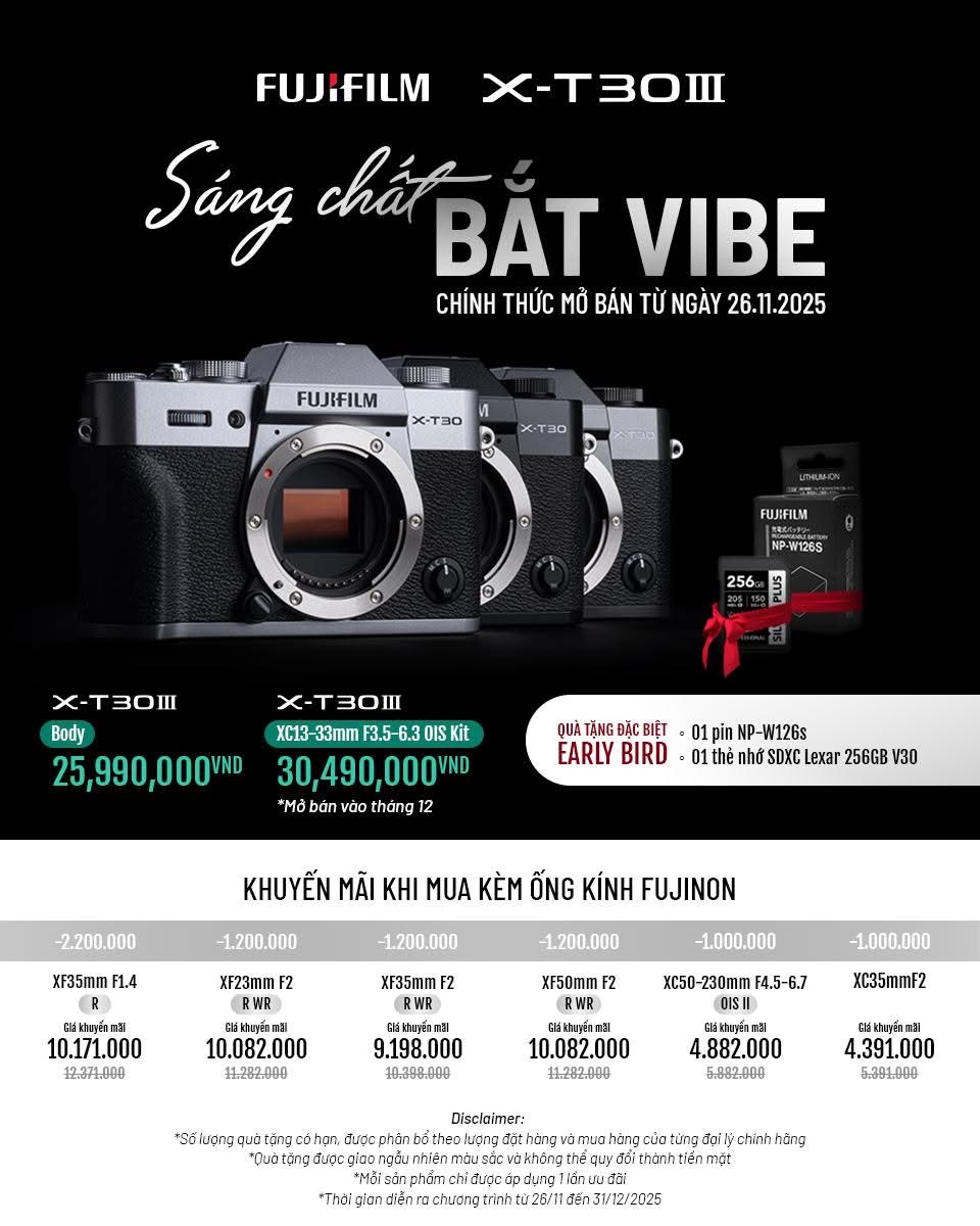 Ngày 26.11.2025, chiếc Fujifilm X-T30 III sẽ chính thức lên kệ tại các showroom Fujifilm X-Space và đại lý ủy quyền toàn quốc.