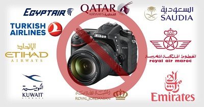 Hoa Kỳ đã ban hành lệnh cấm đối với máy ảnh, máy tính xách tay, máy tính bảng và các thiết bị điện tử cầm tay khác mang theo trên các chuyến bay từ 10 sân bay ở 8 quốc gia. Luật mới này sẽ có hiệu lực từ ngày 21/2/17. Ngay sau khi lệnh cấm của Hoa Kỳ được thông báo, Anh Quốc cũng đã tuân thủ điều luật trên.