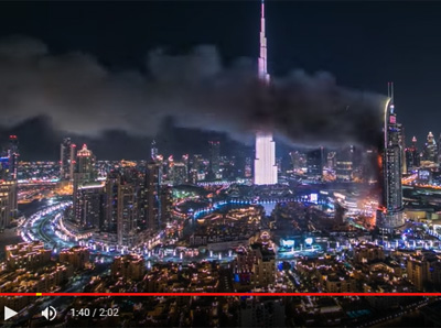 Khi khách sạn Dubai Address Downtown cao 63 tầng Dubai cháy lớn thành ngọn lửa đỏ rực vào đêm giao thừa đón năm mới, phóng viên ảnh Dennis Mallari đã tự treo mình từ dây cáp trên tầng thứ 48 tòa nhà gần đó và chụp được bộ ảnh này cho thấy ngọn lửa phun khói trông tòa nhà như cục than hồng rực lên đường chân trời Dubai.